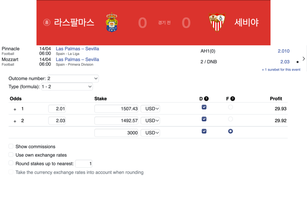 슈어벳에 대해 예를 들어보겠습니다. 4월 14일 21:00에 진행되는 라스팔마스와 세비야 경기는 확정수익 1%의 경기로 피나클 사이트에서 Las Palmas 0핸디 2.01 배당, 그리고 Mozzart 또는 1xBET 사이트에서 Sevilla DNB 2.03 배당에 베팅하는 형태입니다. 만약 3,000 달러의 자금으로 베팅을 진행한다면 피나클 사이트 2.01 배당에는 1,507 달러 베팅, 1xBET 사이트 2.03 배당에는 1,492 달러를 베팅합니다.