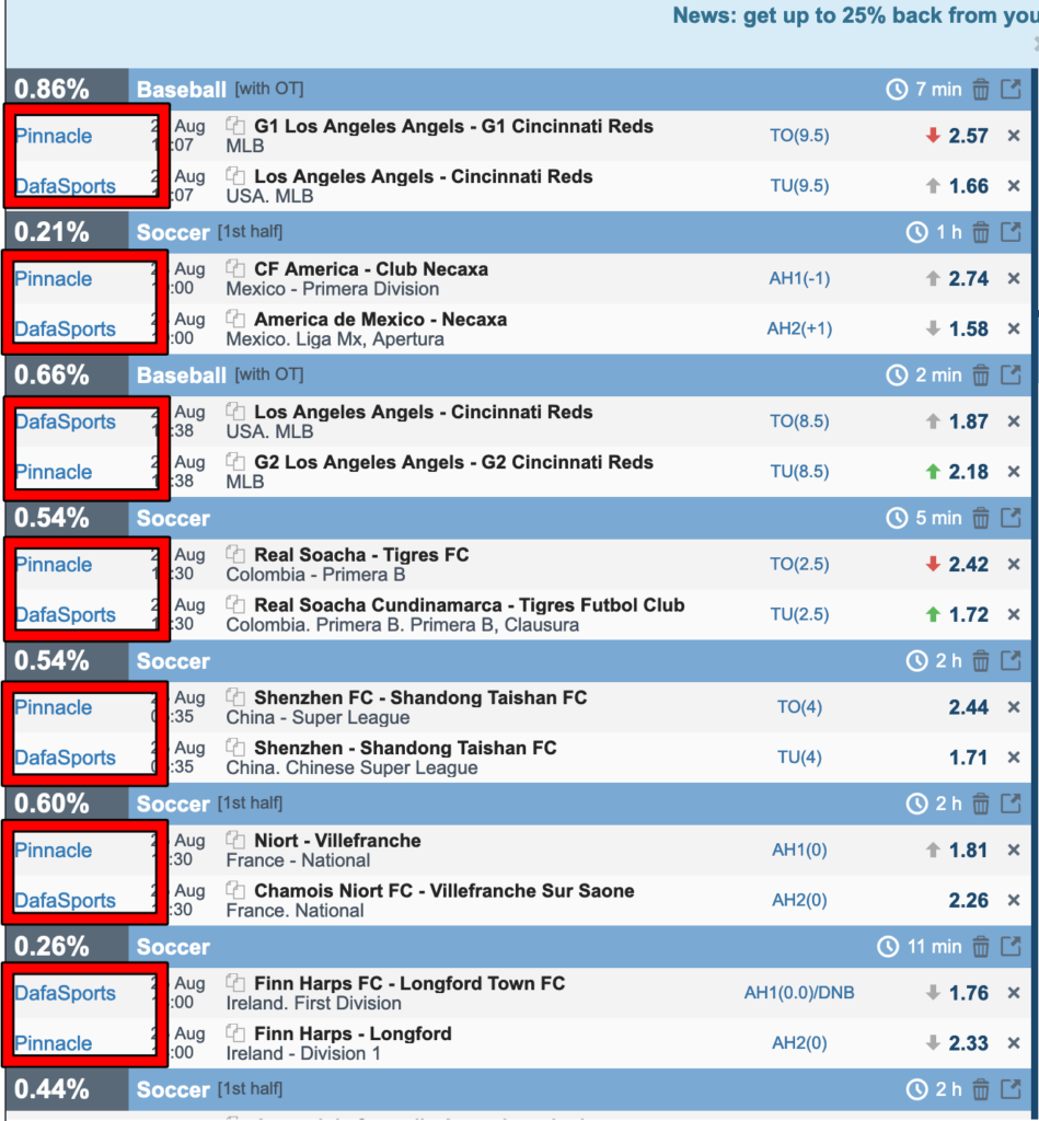 아래와 같이 양방 프로그램에 나타나는 경기의 중 높은 빈도로 피나클, 다파벳의 매칭으로 나타납니다.