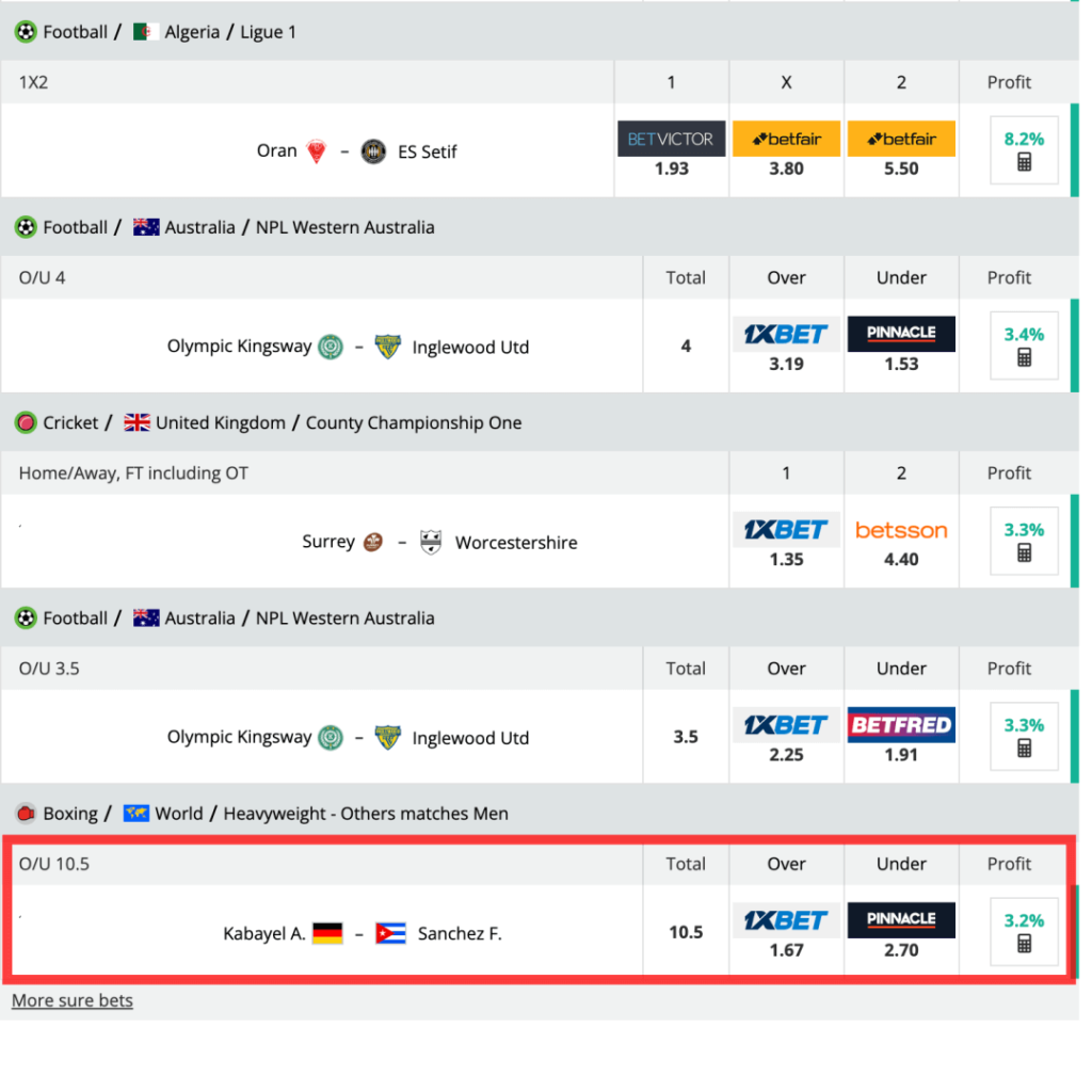 프로그램을 통한 양방배팅을 진행하기 전 배팅가능한 경기, 배팅 가능한 사이트를 먼저 확인해봐야하는데, 양방수익률이 높다고해서 기준없이 양방배팅을 진행하면 안됩니다. 양방수익이 높은 경기들을 배당이 바뀌기 전에 빠르게 양방배팅을 하다보면 실수로인한 손실이 발생할 수 있는데 팀이름을 확인하는 습관이 필요합니다. 오늘 공유할 경기는 아기트 카바엘 VS 산체스의 복싱 경기이며 양방수익은 3.2%입니다. 이 보다 더 높은 수익률의 양방배팅의 기회가 있지만 다른 사이트들은 양방 제재가 심하거나 한국유저 가입을 허용하지 않기때문에 배당이 높고 한국인 유저가 자유롭게 이용할 수 있는 1xBET과 피나클을 통해 양방배팅을 진행해보겠습니다.