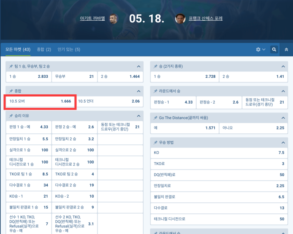 배팅을 진행할 경기를 선택했다면 사이트로 이동하여 배당 변동이 없는지 확인하는 절차가 필요합니다. 복싱 경기는 다른 경기에 비해 경기규칙이 단조롭기때문에 양방배팅 실수없이 비교적 편하게 양방배팅을 진행할 수 있습니다. 이 경기는 TOTAL 10.5 언더 오버 배팅 기준의 양방이며, 복싱에서의 언더오버는 라운드를 뜻합니다. 양방사이트 1xBET은 10.5 오버 1.67 배당인데, 11라운드 또는 12라운드까지 경기가 진행된다는 예측이 정배이고, 피나클은 10라운드 이전에 경기가 끝난다는 예측이 2.7 역배인것을 보면 12라운드 판정까지 진행될 확률이 높은경기라 할 수 있습니다. 하지만 양방배팅에서는 경기결과와 관계없이 확정수익이 발생하기때문에 분석의 필요는 없습니다.